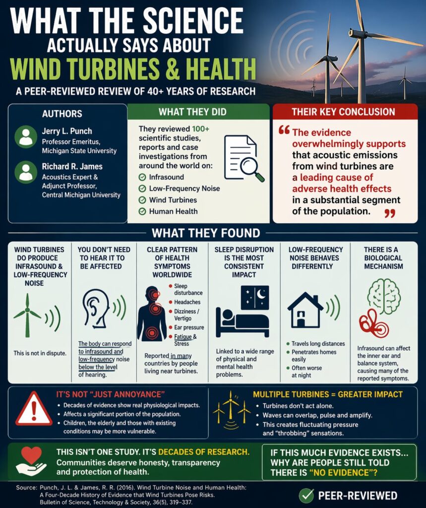 In their 2016 peer-reviewed study, authors Dr. Jerry Punch and Richard R. James found four decades of evidence that wind turbines pose serious health risks. In an interview with The Spin of Wind, Dr. Punch summarizes their findings: